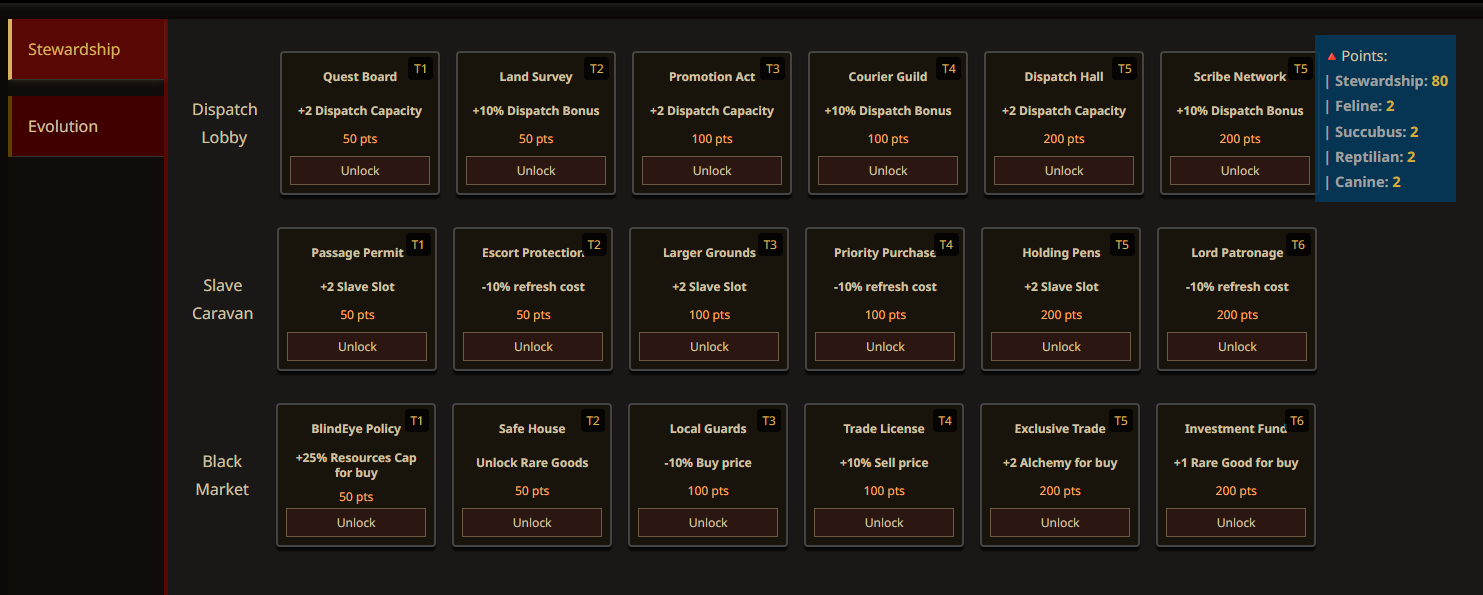 - Additions: Baron Territory Management Tech Tree. <br>Management Tech Points gained from added human population. Currently offers Dispatch, Black Market, and Slavery branches.